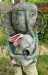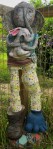 This guy lives in the garden for now. He is quite large, measuring around three feet. He was built in two sections and fastened together after the final firing. he is mixed media, I did use nichrome wire and acrylic paint as well as mosaic materials on the base.